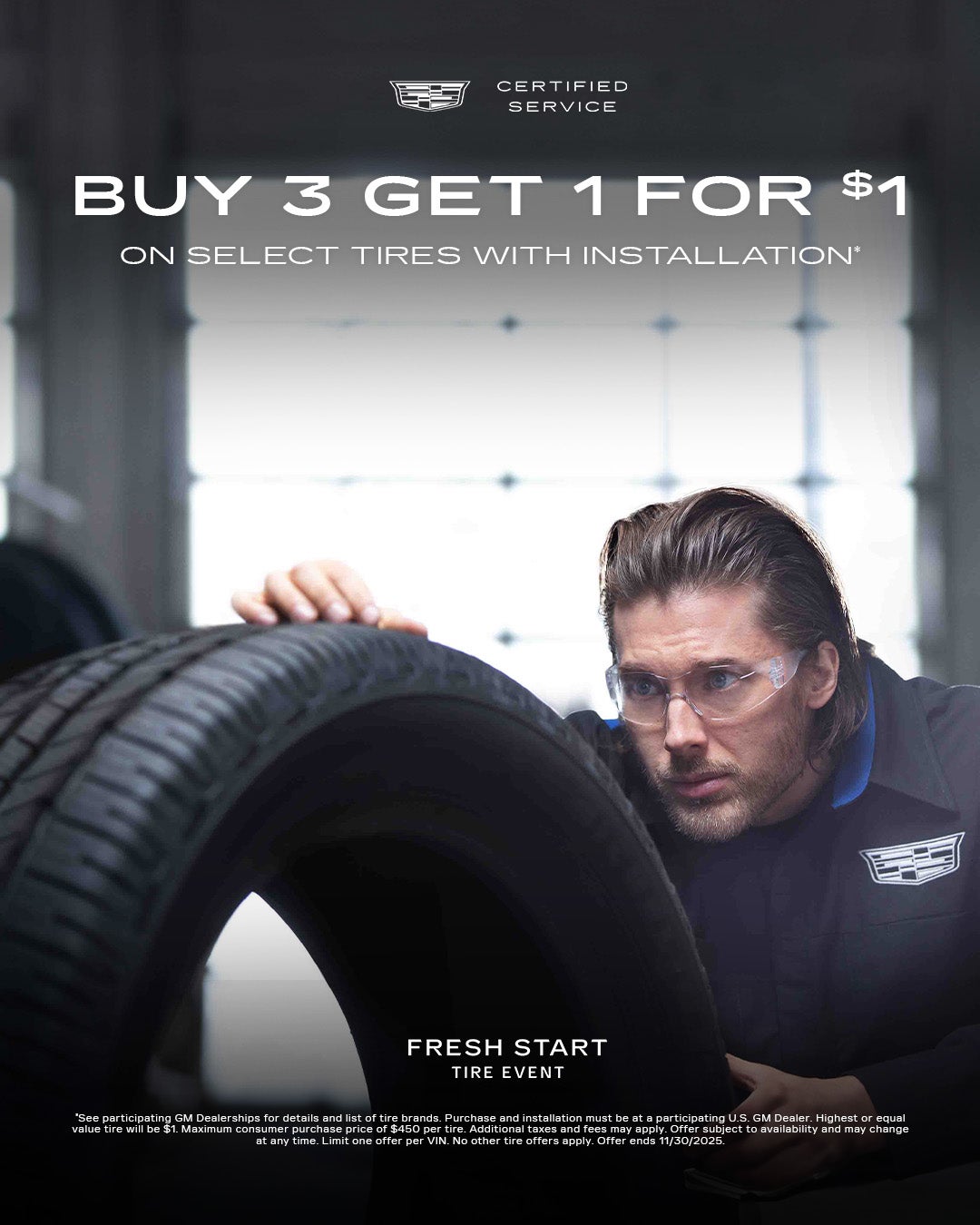 Purchase and installation must be at Cadillac of South San Francisco. See dealership for tire details. Highest or equal value tire will be $1. Maximum consumer purchase price of $450 per tire. Additional taxes and fees may apply. Offer subject to availability and may change at any time. Limit one offer per VIN. No other tire offers apply. Offer ends 5/31/2026.